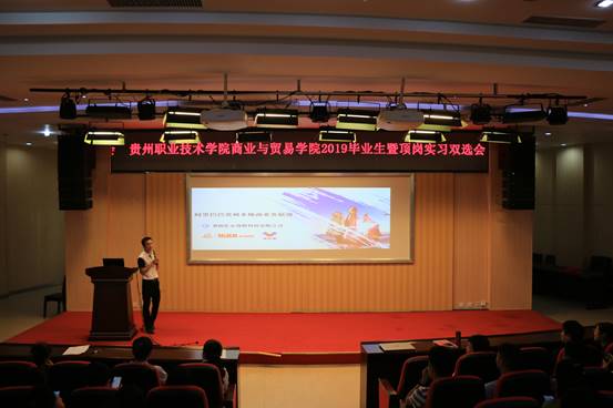 双选会分为两个部分进行,第一部分为图书馆报告厅举行的宣讲会。宣讲会按照三个流程进行,首先由商贸学院彭琳院长进行开场发言,彭琳院长由衷的表现出了学校、学院、老师对同学们寄予的厚望,同时也希望参会的企业代表能在此次招聘会中寻找到心仪的人才;接下来由教师代表黄守峰老师进行发言,黄守峰老师将同学们进行顶岗实习之前需要上交的材料以及顶岗实习期间的注意事项等告知同学们,同时,还强调了诸如诈骗、传销等安全问题;最后,由企业代表进行宣讲,参加此次宣讲会的企业有阿里巴巴、幸福树地产、京东物流等贵州知名企业,企业代表从企业文化、企业需求、招聘方式等几个方面分别对同学们进行了讲述。