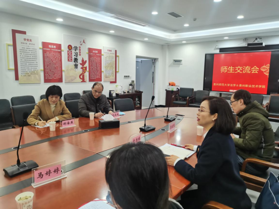 贵州师范大学法学院综合法学系主任包运成、经济法学系主任谢海燕,贵州职业技术学院教务处副处长马婷婷、学籍管理科郭静老师、商贸学院院长袁德臻、法律教研室主任李爱民出席会议,联合培养2021级法学本科班、电子商务本科班学生参加交流会。