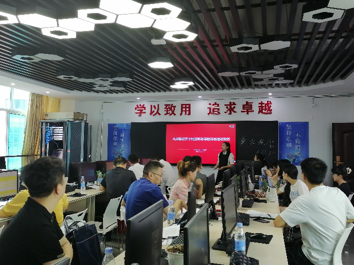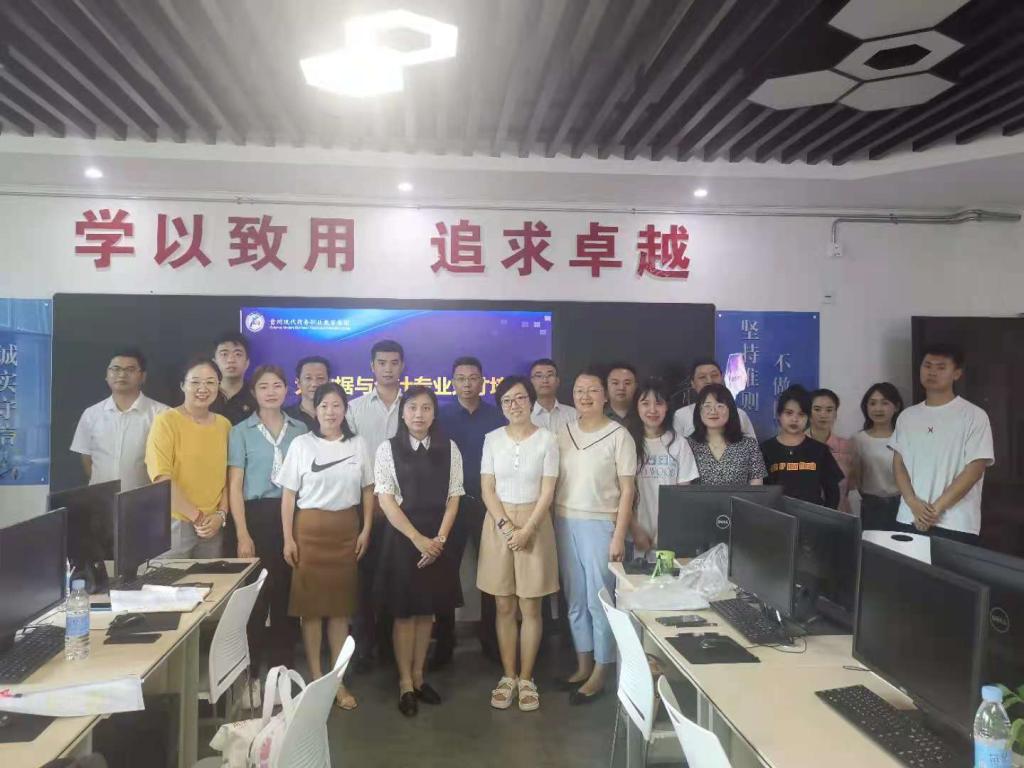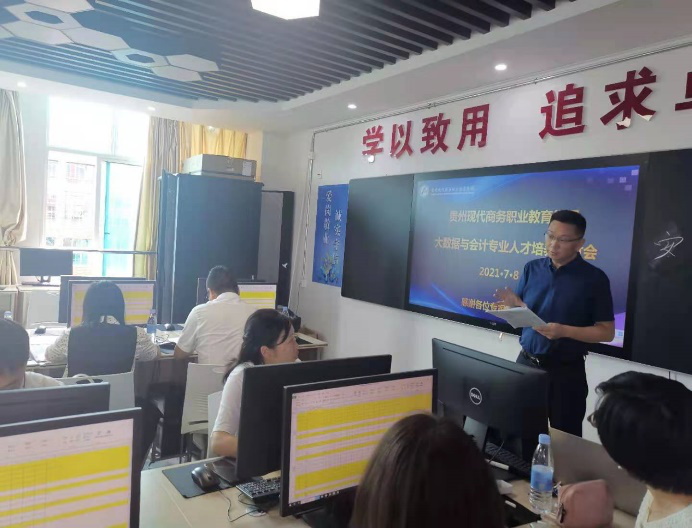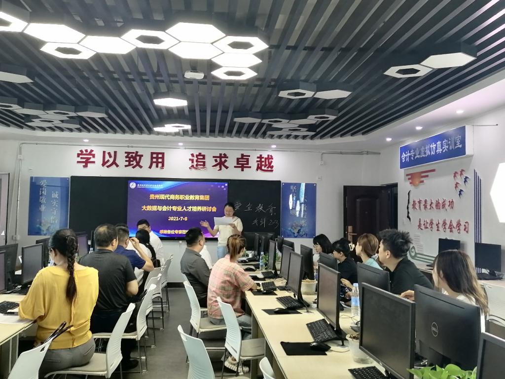 2021年7月8日上午,为全面贯彻职业教育专业动态更新要求,进一步推动“岗课赛证融通”综合育人,不断提高人才培养质量,贵州现代商务职业教育集团在笃行楼会计专业虚拟仿真实训室举行大数据与会计专业人才培养研讨会。会议特别邀请贵阳市财税服务机构行业协会法人秘书长徐彦文、新道科技股份有限公司西南大区副总陈自洪、贵州友道数智技术有限公司总经理邓辉、厦门网中网软件有限公司区域经理黎柯娟以及2013、2014、2015、2017级优秀毕业生唐龙、罗云琴、王宇雁、龙晓家出席,与专业全体教师共同探讨大数据与会计专业人才培养的新模式。