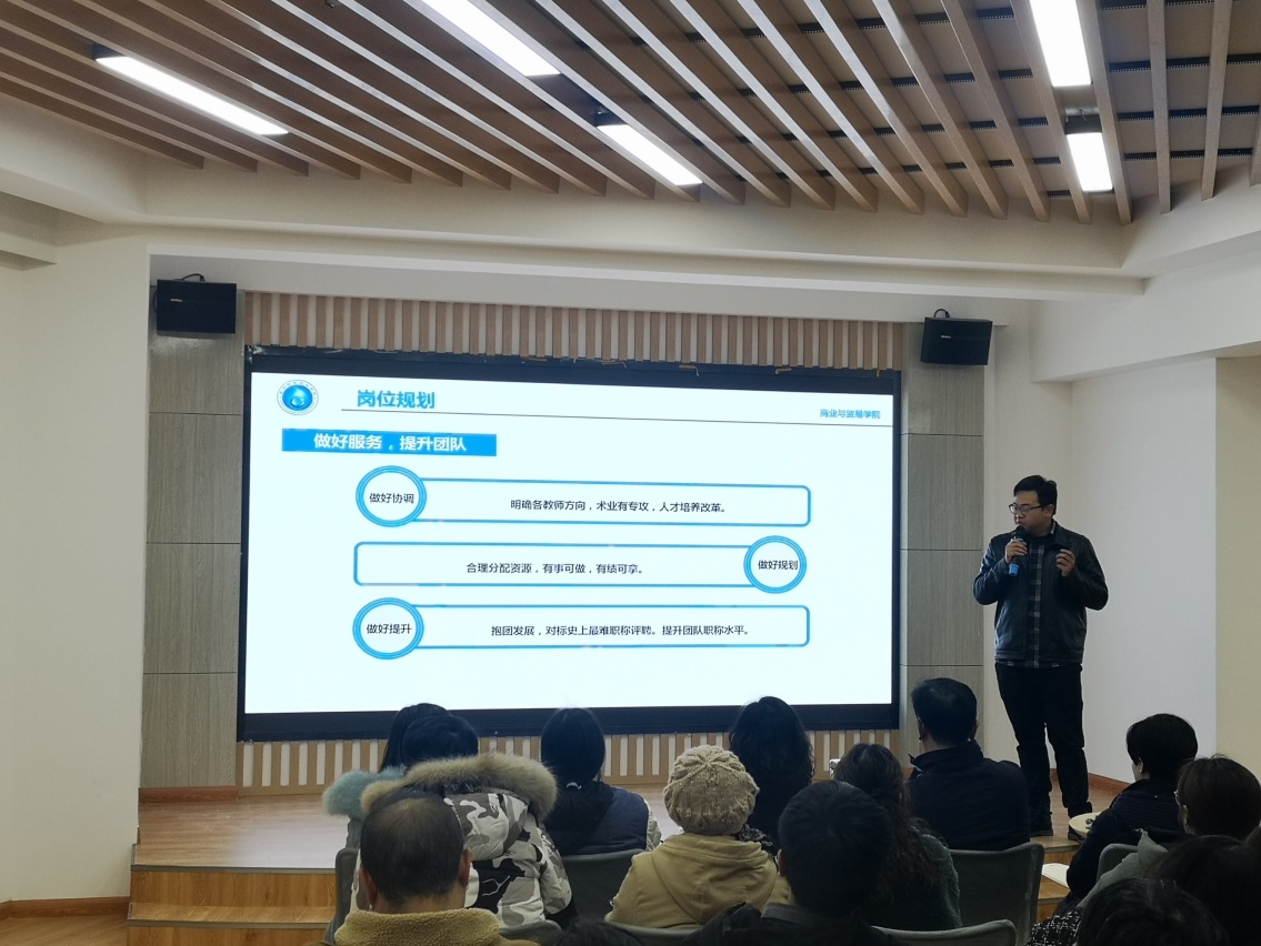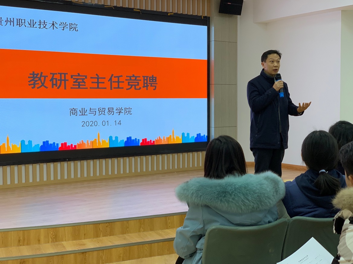 为了使学院教研室管理工作更科学规范,依据学校教研室主任管理文件的精神,根据学院专业发展及建设需要,商贸学院在原有的电商、物流和包装营销三个教研室基础上合并为电商营销教研室(包含电子商务和市场营销两个专业)和物流物业(包含物流管理和物业管理两个专业)两个教研室,法律教研室维持不变。根据新设立的教研室建设需求,学院发布了《商业与贸易学院教研室主任竞聘工作实施方案》,经过前期动员会,共计7名老师报名参加竞聘,学院于2020年1月14日14:30在笃行楼2楼现代商务产教融合实训基地创客中心开展了教研室主任竞聘现场演讲。