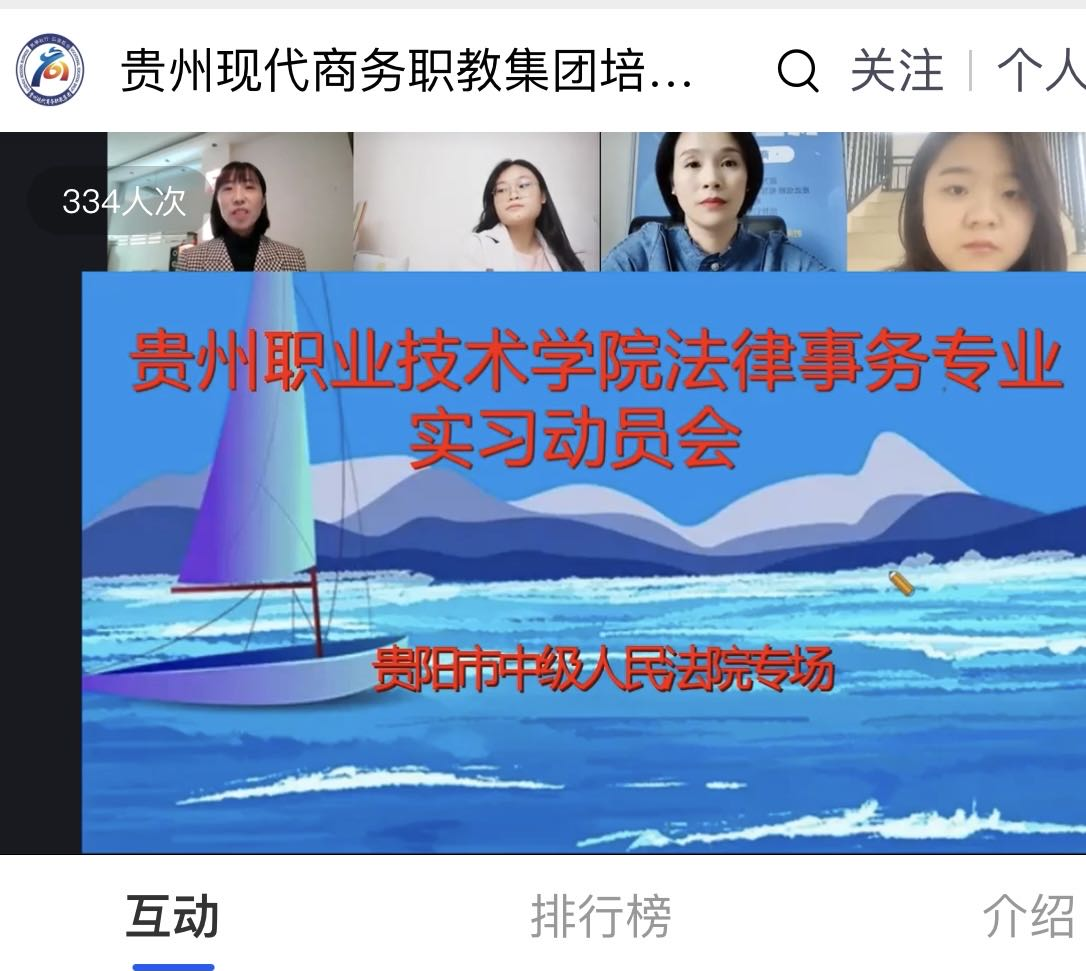 2022年10月12日下午2:00我校商贸学院就2020级法律事务专业学生赴贵阳中院岗位实习在贵州现代商务职教集团培训平台开展专场动员会。商贸学院院长袁德臻老师、法律教研室全体教师、我校法律事务专业毕业生代表、2020级法律事务专业辅导员和全体学生参加。会议由商贸学院法律教研室陈云英老师主持。