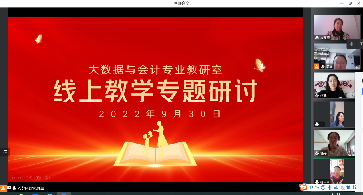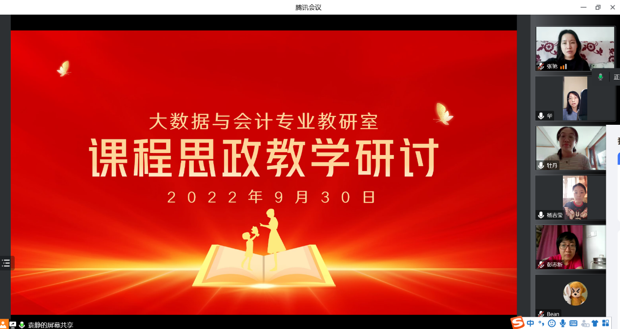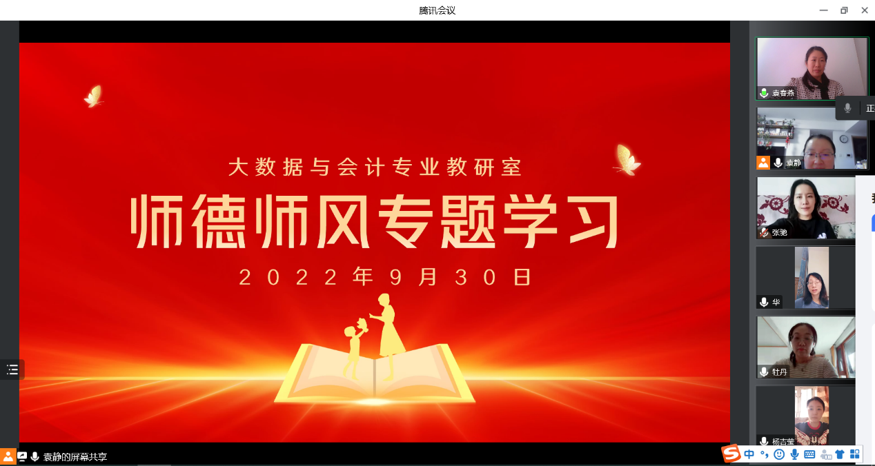 为进一步加强教师队伍师德师风建设,认真落实上级关于师德师风建设的相关文件精神,提升线上教学质量,2022年9月30日下午2:30,商贸学院大数据与会计教研室的全体教师通过腾讯会议开展了师德师风及线上教学研讨学习。本次学习研讨分为两个内容,首先,大数据与会计教研室主任袁静老师带领大家学习师德师风的相关内容,学习内容包括:1. 深入学习习近平总书记关于教育的重要论述;2. 走近2022年全国教书育人楷模;3. 《闪亮的名字——2022最美教师发布仪式》;4. 《关于印发新型冠状病毒肺炎防控方案(第九版)的通知》;5.《关于印发高等学校、中小学校和托幼机构新冠肺炎疫情防控技术方案(第六版)的通知》;6.《省教育厅办公室关于加强疫情防控期间教师队伍管理的通知》。第二,通过钉钉开展线上教学交流经验,总结不足;第三,对课程思政实施与完善进行研讨。