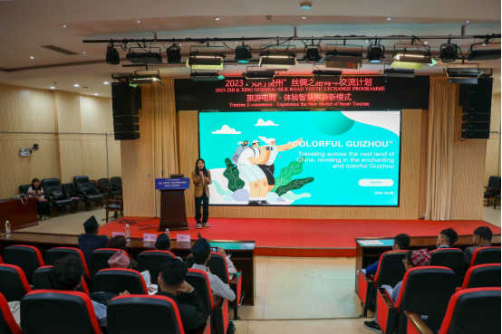 商业与贸易学院张竟老师为尼泊尔师生上了一堂以“多彩贵州 电商旅游”为主题的培训课程,将贵州的山水、美食、文化和民族服饰结合贵州电商发展概况介绍给了尼泊尔师生。