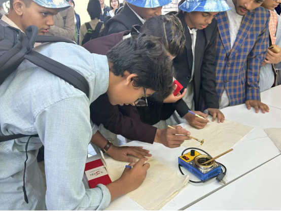 同时,尼泊尔师生在学院师生的引导下动手体验了贵州苗族蜡染的制作过程。