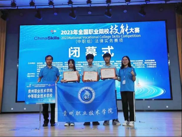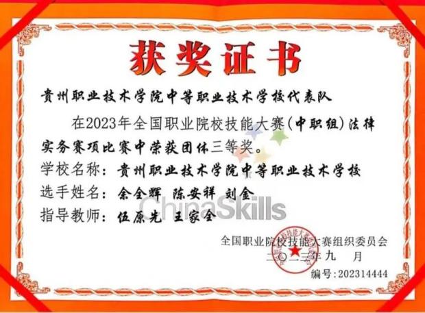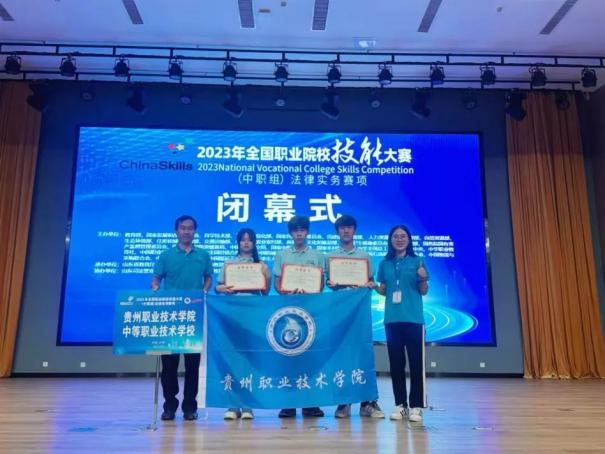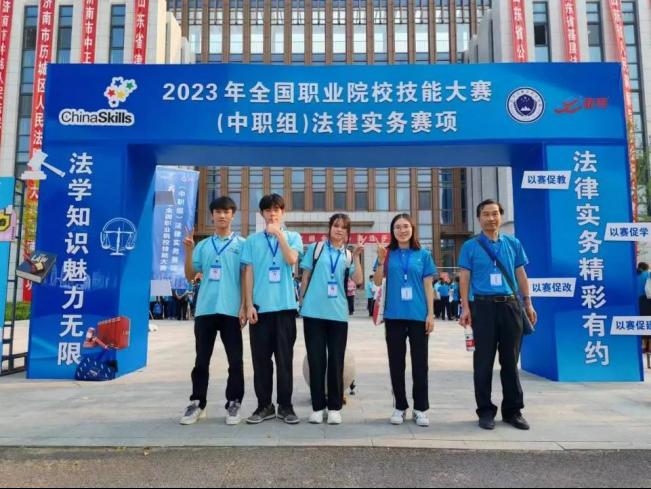 在2023年全国职业院校技能大赛法律实务(中职组)赛项中,商业与贸易学院教师伍原先、王家全指导余全辉、陈安祥、刘金三名学生组成一支队伍参赛,从来自全国30支代表团队、90名参赛选手中脱颖而出,荣获法律实务团体三等奖的优异成绩,展示了学校高素质技术技能型人才培养成效。