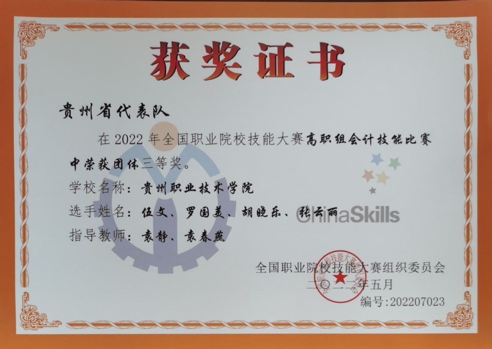 2022年8月21日-23日,全国职业院校技能大赛高职组会计技能赛项在四川财经职业学院隆重举行。大赛由教育部、四川省人民政府、国家发展和改革委等三十六部门联合主办,四川省教育厅、四川省财政厅、成都市人民政府共同承办,四川财经职业学院协办。来自全国各省、自治区、直辖市的63支代表队252名选手参加比赛。商贸学院大数据与会计专业袁静和袁春燕老师指导的伍文、罗国美、胡晓乐、张云丽代表队经过三个赛段的激烈角逐,荣获“会计技能”赛项(高职组)国家级三等奖。