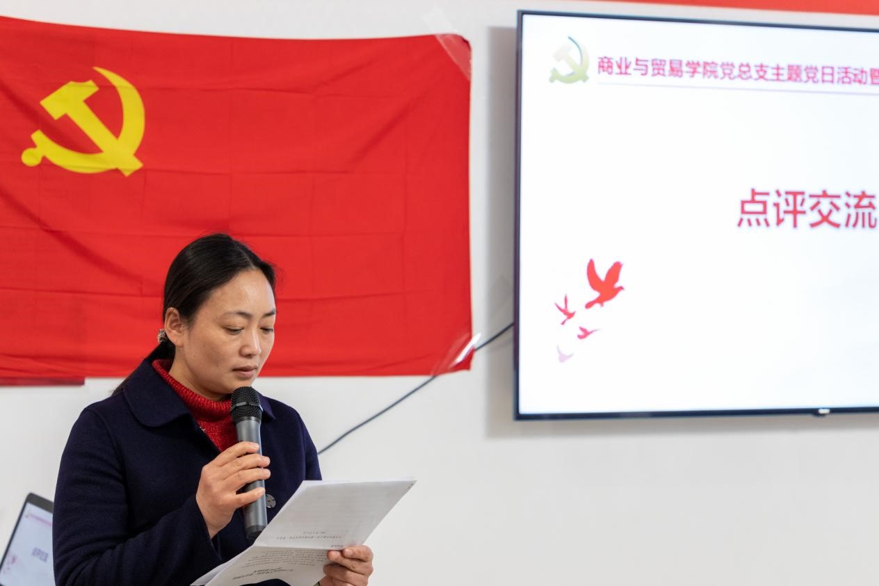 最后,汪红副校长对活动进行点评,表示商贸学院党总支以理论学习、诗歌朗诵、情景剧等多种形式,联动党支部开展主题党日活动,做到形式十分创新、内容十分精彩、意义十分深远,鼓励学院要在主题党日活动多样性、多元化方面继续探索创新,在学校党委组织部基层党建交流观摩活动中不断学习积累,以党建为引领,不断瞄准新目标、启发新思路,不断激发新潜能、触发新活力,为学校高质量建设贡献商贸力量,以实际行动迎接党的二十大胜利召开!