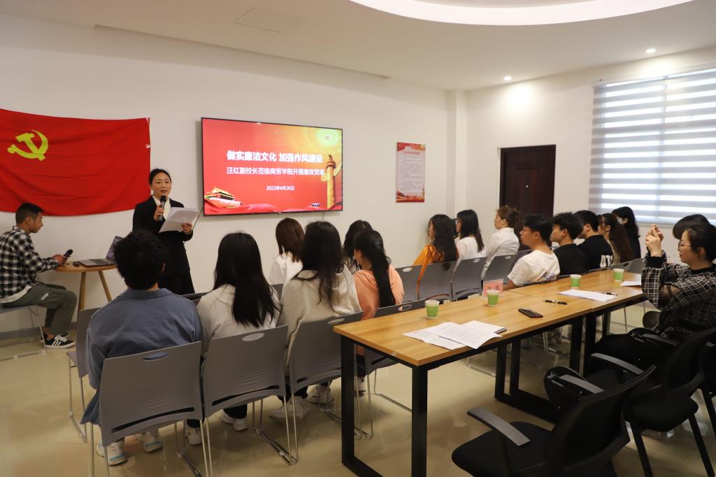 在全省上下紧跟时代号角、深入学习贯彻中国共产党贵州省第十三次代表大会精神之际,为持续维护学校良好政治生态,推动全面从严治党向基层延伸取得更大实效,4月26日,学校党委委员、副校长汪红在商业与贸易学院讲授廉政党课,开展校领导联系师生“面对面”座谈会。商贸学院领导班子、电子商务专业群党支部党员与学生代表60余人参加活动。