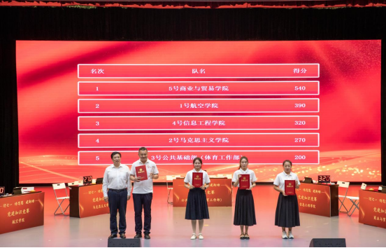 此次比赛分为初赛和决赛两个环节,初赛采用笔试方式进行,商贸学院力战群雄,顺利晋级。7月1日大礼堂举行了决赛,现场反响强烈,热闹非凡。决赛采用现场问答的方式进行,包括“必答题”“抢答题”和“风险题”三个环节。在“必答题”环节,各队竞争激烈,不相上下,分数基本持平;“抢答题”环节将全场气氛推向高潮,五支参赛队伍各显神通,争分夺秒,以便能以最快的速度按下抢答器获得答题资格。商贸学院副院长吕进元在紧张的氛围中沉着冷静,眼疾手快,多次最先、最快按下抢答器,为商贸学院获得最多的答题机会;其他队员相互配合,集思广益,选出最优答案,在抢答环节频频涨分,和其他参赛队伍拉开了差距;最后进入“风险题”环节,有的队伍破釜沉舟,选择分值最高、风险最大的题目作答,实现后发赶超;商贸学院采取保守策略,选择回答中风险题,最后以总分540分的成绩脱颖而出,摘取了此次知识竞赛的桂冠。