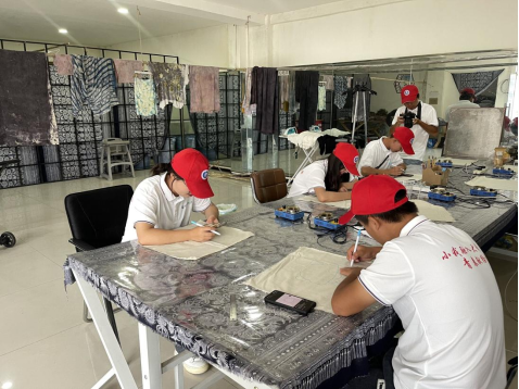 7月18日-19日,实践队来到贵定县弘盛黔民族文化有限公司,采访公司总经理、蜡染传承人陈玲,聆听 “非遗文化传承人”与“民族传统技艺——花苗蜡染”之间的故事,了解她的创业经历。2016年,担心民族传统技艺失传的她毅然放弃了自己原本发展良好的事业,投身于蜡染技艺的传承和发展中,她期望通过蜡染作品更好地承载和展现苗族文化魅力,在民族技艺的传承和创新中带动地方的旅游文化发展,助力乡村振兴。陈玲说:“民族文化是一种文化资产,是值得保护和传承的,我们不用去模仿外来文化,要把我们自己优秀的民族技艺发扬光大,民族的就是世界的。”