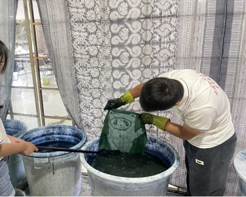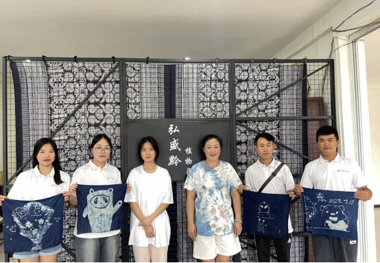 为了更好了解“花苗蜡染”技艺的独特之处,陈玲老师带领实践队师生亲身体验蜡染制作的全过程。蜡染的基本原理是用蜡质勾勒出需要的花型,行话称为“留白”,然后进行多次浸透染色,最终经过冲洗、煮沸、漂洗、晾晒等步骤,就能得出一副蜡染作品。这一系列的步骤耗时较长,考验耐心,通过沉浸式的体验学习,队员们按照陈玲老师的指导完成了自己的蜡染作品。拿着具有个性符号和自身特色的文创作品,大家体会到蜡染是一项浸润了时间、留白了空间的民族文化传统技艺,在其形成原理和操作过程中无处不透露着人生的真谛和丰富的文化,激发了青年学生对于民族传统文化的热爱和向往。