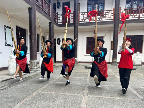 “我想把原汁原味的长衫龙传下去,引导学生在传承中努力创新,将我们的民族文化发扬光大”,在兰衡老师的“长衫龙”文化工作室他这样说道。今天的“长衫龙”与时俱进,打破传男不传女、传内不传外的“旧规”,在传承人的接续奋斗和政府、学校的共同努力下,让濒临失传的民族瑰宝走出村寨、走进校园、走向世界,2006“苗族长衫龙长鼓舞”被列为国家非物质文化遗产。采访结束后,实践队志愿者更是换上了“长衫龙”舞蹈服装,跟随兰衡老师跳起了长鼓舞。看着他们认真学习、投入舞蹈的样子,兰老师满面笑容,他说“今天的活动是一根接力棒,从我的手中递到了青年志愿者的手上,希望你们带着这份文化自信回到学校、回到地方,讲好多彩贵州的文化故事