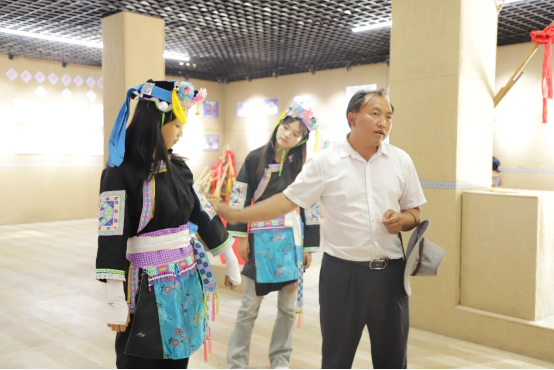 7月16-17日,实践队来到贵定一中,据了解贵定一中以苗族布依族学生居多,他们有一门特有的苗族文化体验课——“长衫龙”长鼓舞,课程由国家级非遗传承人兰衡老师教授,是在校学生必修的一门文化课,也是遴选非遗技艺传承人、弘扬少数民族文化的最有效方式。穿过校园文化走廊,实践队参观了“长衫龙”长鼓舞展馆,在贵定一中学生精彩的表演照片中拉满了对“长衫龙”长鼓舞的期待值。