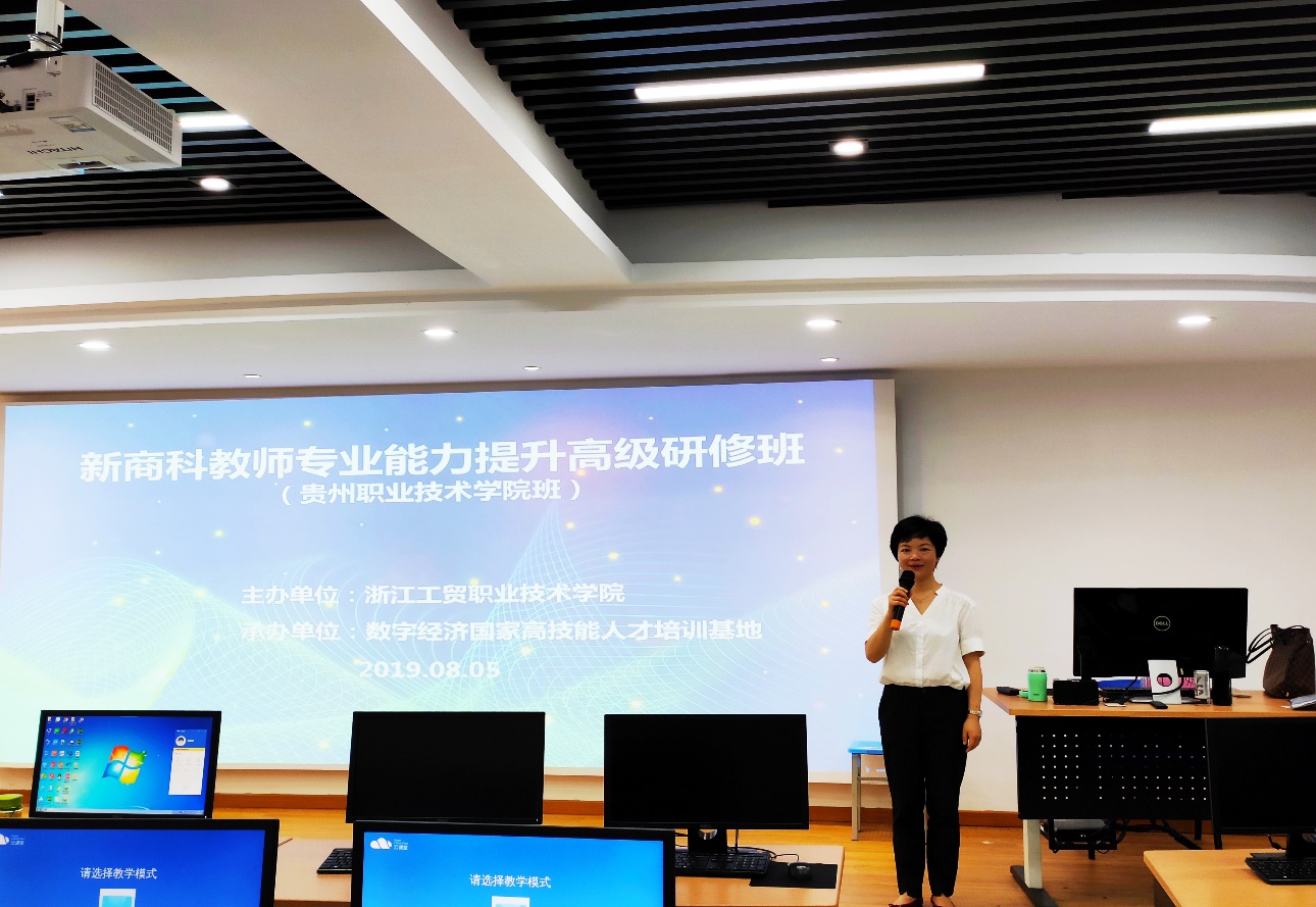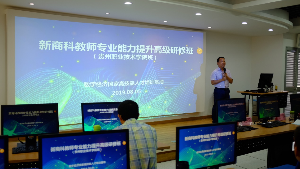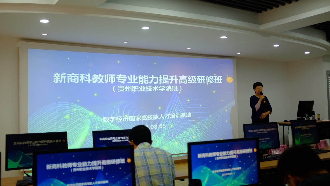 8月5日上午,贵州广播电视大学(贵州职业技术学院)商业与贸易学院新商科教师专业能力提升高级研修班开班在浙江工贸职业技术学院的数字经济国家高技能人才培养基地举行开班仪式。出席本次会议有浙江工贸职业技术学院经贸分院成荣芬院长和研修班培训师团队,贵州广播电视大学(贵州职业技术学院)商贸学院蔡昆副院长和15名专业教师参加。