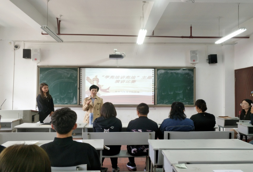 为响应党的十九大号召,深入学习习近平总书记系列重要讲话,认真贯彻全国“七五”普法规划,弘扬宪法精神,我校现举办以“学宪法、讲宪法”为主题的演讲比赛。商业与贸易学院积极配合学校整体活动方案,面向本院所有在校生,开展院级选拔赛。于2019年10月11日举行演讲比赛初赛,并在10月18日完成了决赛的赛程,选拔出一名优秀学生作为学院代表参加校级比赛。