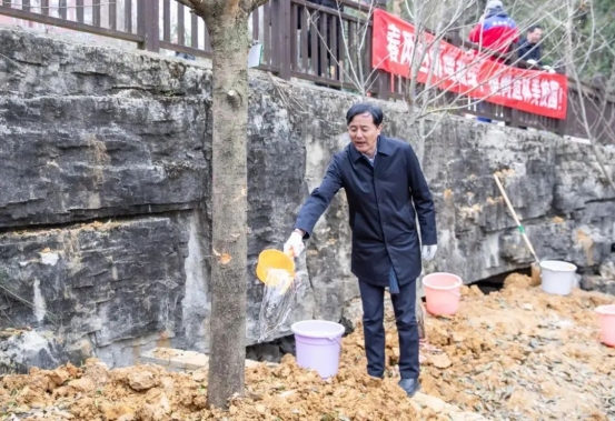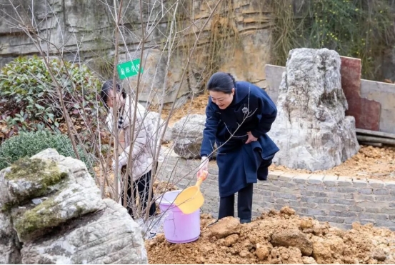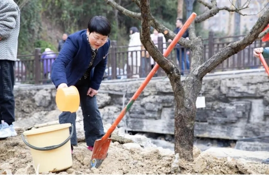 植树现场,学校领导和参与师生按划定区域分组行动,配合有序,抬树、挑坑、扶苗、提苗,培土、踩实、围堰、浇水有条不紊。不多时,新栽种的树苗傲然挺立于景观水池,顿时为校园增添几分青绿和活力。这一片承载着丰富生态绿意和文化诗意的景观水池,必将成为开大校园文化建设的新地标。