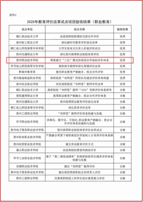 近日,贵州省教育评价改革试点项目验收结果正式揭晓。我校精心组织、深入推进的《探索建立“三化”模式的高层次学徒制评价体系》项目,在激烈的省级评审中脱颖而出,获评“优秀”等次,成为全省26所参验高职院校中获此荣誉的9个项目之一,标志着我校在教育评价改革领域取得了突破性进展。
